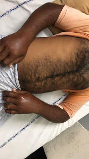Initial examination revealed, the patient was conscious, coherent and co-operative, lying in bed in supine position. He was in some visibly apparent distress with flexion at his elbows and wrists, bilaterally, which were mildly painful when resting on the bed and his abdomen, respectively. The patient was dressed in a round neck t-shirt and when asked to sit up and take his t-shirt off, he had significant pain and limitation of movements at multiple joints but no weakness.